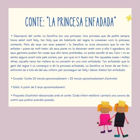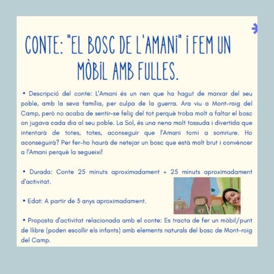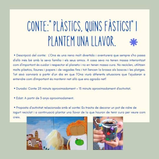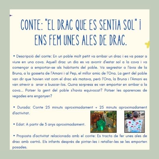 Després del conte, es fa un Taller, adaptat a diferents edats, on els nens poden explorar la seva creativitat i aprendre noves habilitats. Aquestes activitats estan dissenyades per ser educatives i divertides, proporcionant una experiència enriquidora per als participants.